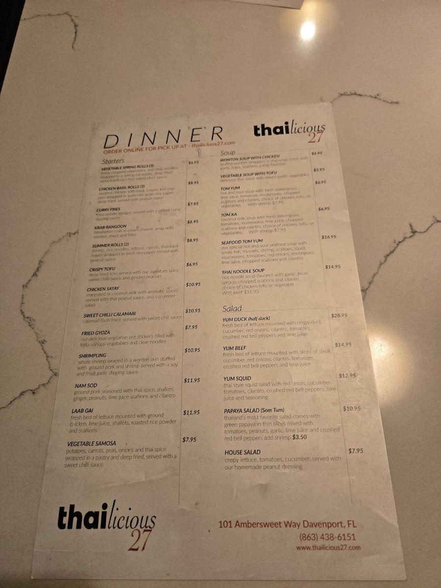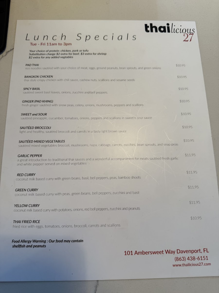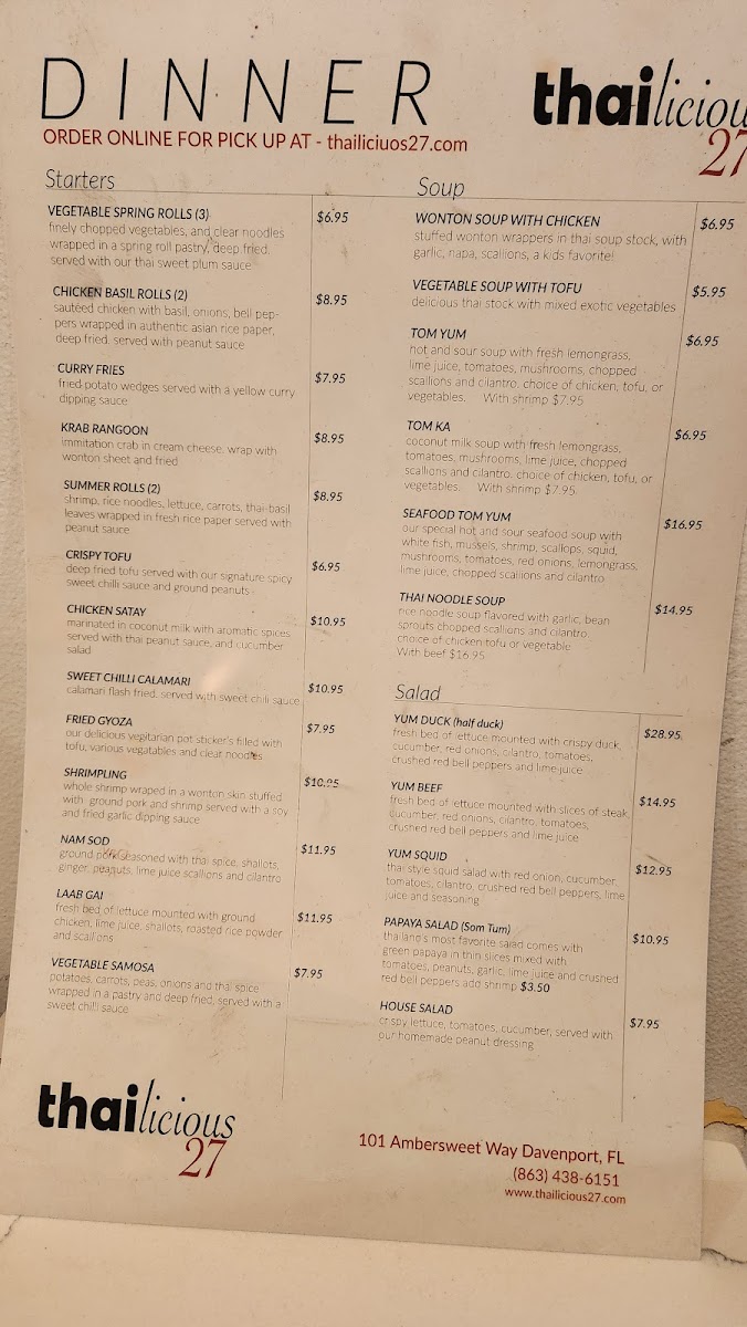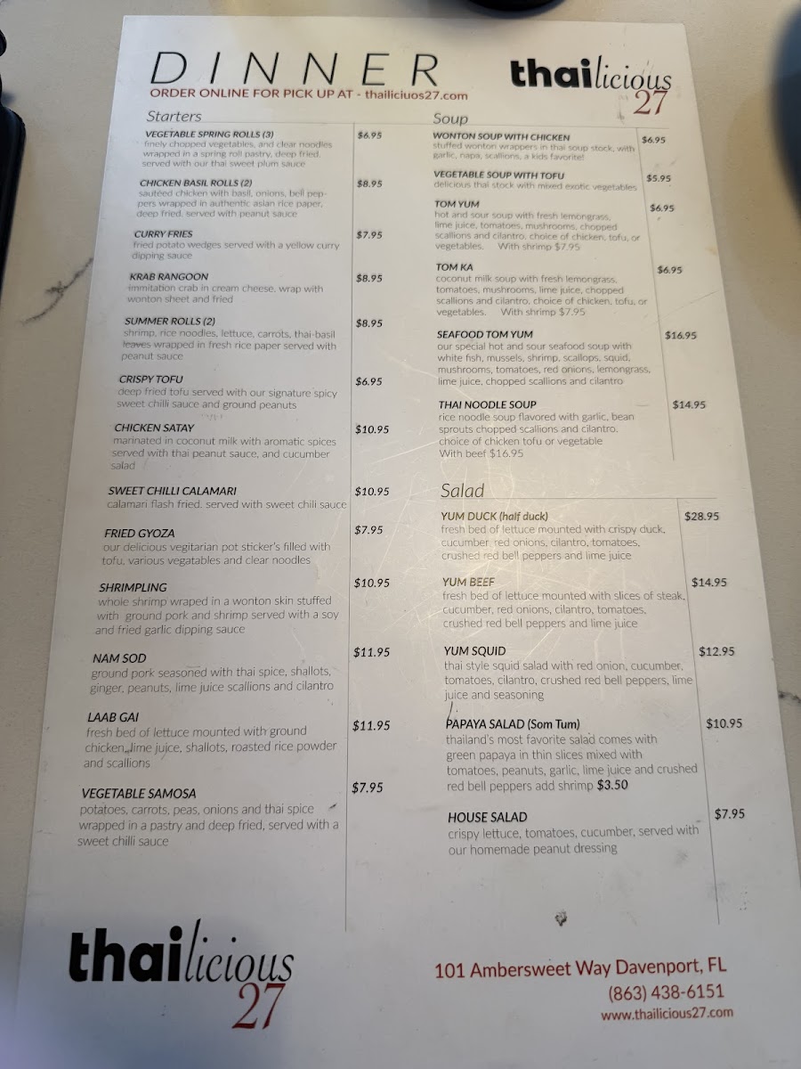 Welcome to Thailicious27, your go-to haven for authentic Thai cuisine nestled in Davenport, Florida. This delightful gem serves a diverse menu that promises to tantalize your taste buds and provide a memorable dining experience. Begin your culinary journey with enticing starters like Vegetable Spring Rolls and Chicken Satay, perfect for sharing or indulging solo.